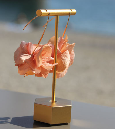 - Composition : fleurs d’hortensia stabilisées Structure en métal (sans nickel) doré à l’or fin (18k).